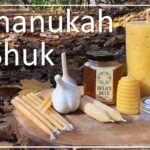 Image shows a photo with text on top of it and a border with honeycomb. The text reads The Shoresh Shuk, Your One-Stop Shop for Chanukah, and has the Shoresh logo on the bottom. The photo is of a variety of Shoresh’s sustainable Jewish ritual products displayed on a stump with a foresty background. The products are a Havdalah candle, garlic bulbs, a pair of Shabbat candles, a jar of honey, a small tub of beeswax healing salve, a handful of Chanukah candles, and a large pillar candle that has a tree-bark-like texture.