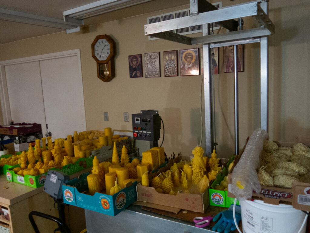 A collection of beautiful beeswax candles in the workshop, made using silicone molds.